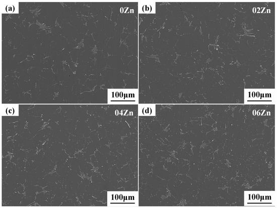 SEM images of as-cast ATX2105-xZn (wt.%) alloys: (a) 0Zn, (b) 0.2Zn, (c) 0.4Zn, and (d) 0.6Zn.