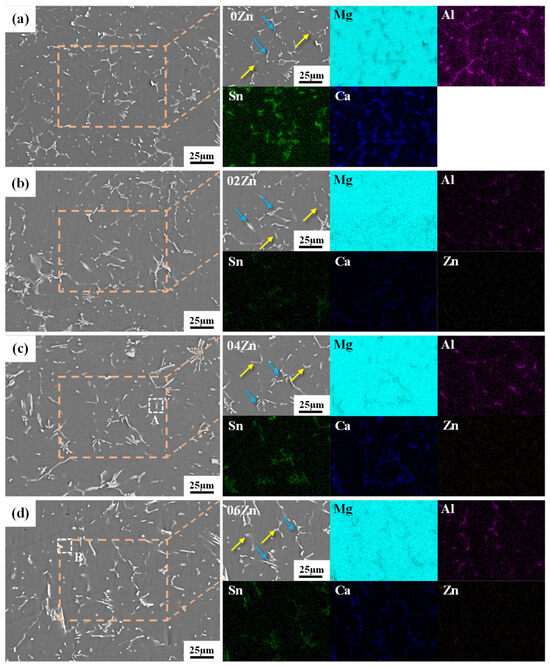 To further determine the composition of secondary phases in as-cast alloys, energy dispersive spectroscopy (EDS) analysis was systematically conducted across alloys with varying Zn contents, as presented in Figure 3 and Figure 4. Note that Figure 4 provides a high-magnification view corresponding to the white dashed box region in Figure 3. Two primary secondary phase types were consistently identified in all four alloys: one phase enriched predominantly in Mg, Sn, and Ca elements, and another phase enriched mainly in Mg, Al, and Ca elements. Via cross-referencing with established literature [27] and our EDS results, these secondary phases are identified as CaMgSn (blue arrow) and (Mg,Al)2Ca (yellow arrow) intermetallic compounds. Both phases exhibit preferential distribution along grain boundaries, a phenomenon driven by the higher free energy at grain boundary regions compared to grain interiors, which thermodynamically favors secondary phase formation to reduce the system’s total energy.