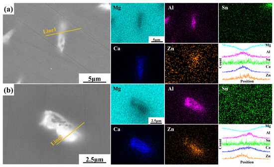 Furthermore, Zn-containing secondary phases were only detected when Zn content reached 0.4 wt.% and 0.6 wt.% (Figure 4). These Zn-bearing phases appeared in limited quantities and were consistently associated with the (Mg,Al)2Ca phase. Based on combined EDS analysis and literature reports [28], this Zn-containing phase is confirmed as Ca2Mg6Zn3. Thermodynamic calculations reveal mixing enthalpies of −45 kJ/mol for Sn-Ca, −20 kJ/mol for Al-Ca, and −22 kJ/mol for Zn-Ca pairs [29,30]. The significantly lower (more negative) enthalpy for Sn-Ca indicates stronger chemical affinity between these elements, facilitating stable compound formation. In the Mg-2.0Al-0.8Sn-0.5Ca-0.2Zn (wt.%) alloy, the higher concentration of Al relative to Zn, combined with Zn’s high solid solubility in the Mg matrix, results in secondary phases dominated by CaMgSn and (Mg,Al)2Ca. However, with sufficient Zn addition, increased Zn chemical potential enables its reaction with Ca to form the stable Ca2Mg6Zn3 intermetallic compound.