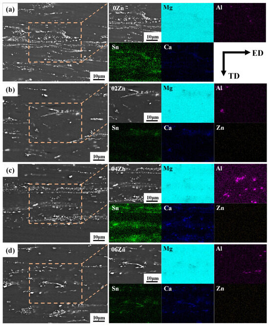 SEM micrographs and corresponding EDS mapping results of extruded ATX2105-xZn (wt.%) sheets: (a) 0Zn, (b) 0.2Zn, (c) 0.4Zn, and (d) 0.6Zn.