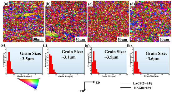 EBSD IPF maps (a–d) and corresponding grain size distribution (e–h) of the extruded alloys: (a,e) ATX2105, (b,f) ATXZ210502, (c,g) ATXZ210504, and (d,h) ATXZ210506.