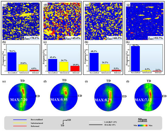 Distribution maps of different types of grains, corresponding statistical charts of their proportions, and {0001} pole figures in extruded alloys: (a–c) ATX2105, (d–f) ATXZ210502, (g–i) ATXZ210504, and (j–l) ATXZ210506.