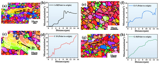 IPF of the selected areas and orientation distribution maps along the drawn lines: (a,b) ATX2105, (c,d) ATXZ210502, (e,f) ATXZ210504, and (g,h) ATXZ210506.