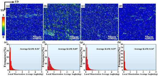 where θ denotes the average misorientation angle, and μ can be understood as the scanning step of EBSD (400 nm in this work). For these calculations, α = 0.3 and M represents the Taylor factor (defined as the reciprocal of the Schmid factor). Consequently, the dislocation strengthening contributions to YS are ~14.5 MPa, ~17.7 MPa, ~13.0 MPa, and ~9.0 MPa, respectively.