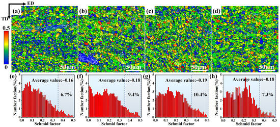 Schmid factor distribution maps (a–d) and corresponding statistical histograms (e–h) for basal slip in the extruded alloys under tensile loading along the ED direction: (a,e) ATX2105, (b,f) ATXZ210502, (c,g) ATXZ210504, and (d,h) ATXZ210506. Dashed boxes highlight high-SF regions.