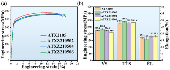 (a) Engineering stress-strain responses of extruded ATX2105-xZn alloys at room temperature; (b) comparative analysis of tensile properties across varying Zn contents.