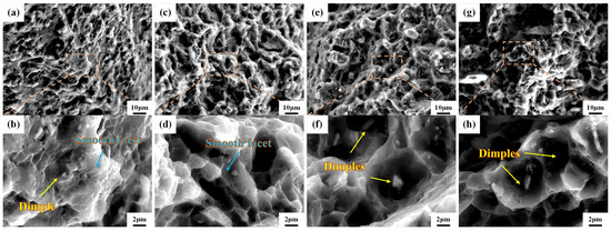 Tensile fracture morphology of: (a,b) ATX2105, (c,d) ATXZ210502, (e,f) ATXZ210504, and (g,h) ATXZ210506.