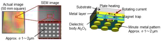 While Figure 2 shows a circular metal pattern, other shapes are possible, such as rectangular or cross shapes. For our study, we chose to use a square pattern. The principle of selective infrared irradiation by the MIM radiation plate is as follows: The three-layered structure of this metal-insulator-metal metamaterial is known to exhibit wavelength selectivity due to its magnetic resonance modes [22,23,24,25,26]. When electromagnetic waves arrive at the MIM structure, anti-parallel currents of specific wavelengths are induced in the upper and lower metal layers. These electric fields generate a magnetic field within the insulator; the changes in both fields amplify each other, enabling selective wavelength electromagnetic wave irradiation and absorption. In the method presented in this study, the MIM emitter is designed so that the main irradiation wavelength coincides with the absorption band generated by the molecular vibration of specific functional groups, which are thought to be involved in hydrogen bond formation between the solute molecules. Examples of target absorption bands include the absorption band attributable to the O-H stretching vibration of the carboxy group at around 3.0–3.3 μm and the absorption band attributable to the C=O stretching vibration of the carbonyl group at around 5.8 μm.