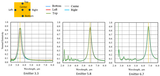 We measured the normal-incident hemispherical reflectance spectra of the emitter having the fabricated MIM structure using a Fourier transform infrared (FTIR) spectrometer with an integrating sphere. We then calculated the normal emissivity spectra based on assuming the sum of reflectance, absorptance, and transmissivity to be 1, Kirchhoff’s law, and the assumption that transmissivity is 0. Figure 4 shows the normal emissivity of each MIM emitter presented in Table 1. The yellow vertical line in each plot indicates the target wavelengths for each emitter. We measured normal emissivity at five points: center, top, bottom, left, and right. Although the spectral shapes of the five points show a slight deviation at 3.3 μm, they are very similar, and the graphs are displayed almost overlapping. Despite small peaks attributable to higher-order resonance modes on the shorter wavelength side, we confirmed that high emissivity is achieved mainly around the target wavelength. For example, in the case of Emitter 3.3, a peak of normal emissivity occurs at around 3.3 μm with a half width of approximately 0.4 μm. The MIM emitter records normal emissivity exceeding 0.84 at all target wavelengths, achieving high values. Figure 5 compares the spectral radiant energy of the MIM emitter and a conventional ceramic heater at equivalent input energies. We see that the MIM emitter exhibits significantly improved narrow-band radiation spectrum characteristics compared to the conventional ceramic heater. Since the radiation energy is strongly dependent on the temperature of the MIM emitter itself, the emitter is typically heated to approximately 600 °C using a separate heat source in the experiments to achieve the desired effect. The infrared energy on the liquid surface is approximately 0.2 to 0.3 [W/cm2].