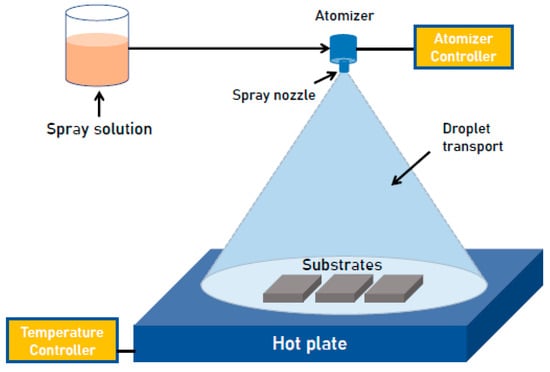 thin films were synthesized via spray pyrolysis. A 0.05 M aqueous solution of Zn(NO3)2·6H2O and Co(NO3)2·6H2O in a 1:2 molar ratio served as the precursor for ZnCo2O4 deposition, while Ce(NO3)2·6H2O was used as the Ce source for doping. Solutions with varying Ce concentrations (x = 0.0, 0.01, 0.03, and 0.05) were mixed with the precursor and stirred for 3–5 min to achieve homogeneity. Before deposition, glass substrates were sequentially cleaned in HCl, ethanol, acetone, and distilled water for 15 min each and then dried using an air stream. The homogeneous solution was sprayed onto preheated glass substrates at 450 °C (Figure 1). The process was optimized with a 40 cm spray-tip distance, a constant flow rate of 1.5 mL/min, and an 8 min spraying duration. The substrate temperature was crucial in ensuring proper decomposition of the solution, leading to high-quality ZnCexCo2-xO4 thin films with strong adhesion.