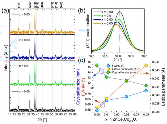 Here, (hkl) represents the crystal plane (311) that was considered for the calculation of crystallite size, θ represents Bragg’s angle, and λ assumes the wavelength of the X-ray (1.5406 Å). As shown in Table 1 and presented in Figure 2c, the lattice parameter exhibits a clear linear increase with rising Ce content. A linear fit of the lattice parameter versus Ce doping level yields relation (4):