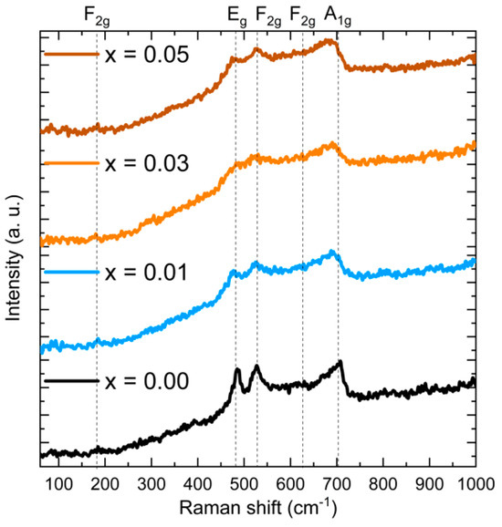 Raman spectra of thin films with different concentrations of Ce (x = 0.00, x = 0.01, x = 0.03, x = 0.05), under an excitation of λ = 532 nm.