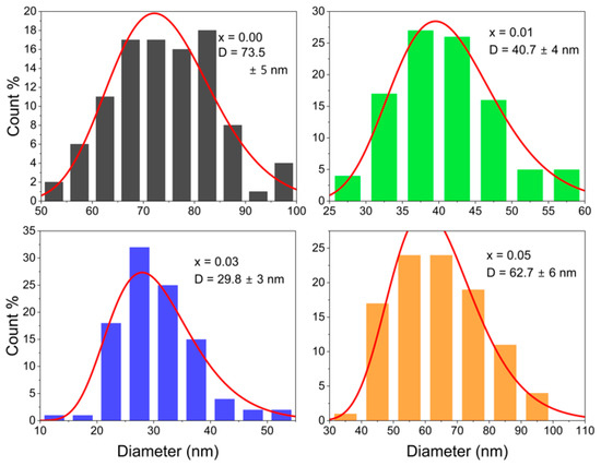 Grain size distribution was analyzed using ImageJ software(Version 1.54k), with histogram fits based on lognormal functions (Figure 5). The average grain sizes were estimated to be 73.5 ± 5 nm, 40.7 ± 4 nm, 29.8 ± 3 nm, and 62.7 ± 6 nm for x = 0.00, x = 0.01, x = 0.03, and x = 0.05, respectively. These SEM-based values are larger than the crystallite sizes obtained from XRD analysis, which is expected since SEM assesses surface-level aggregated grains, while XRD measures the coherent diffracting domains at the atomic scale. The tendency of nanoparticles to cluster is a typical result of surface energy minimization processes [31].