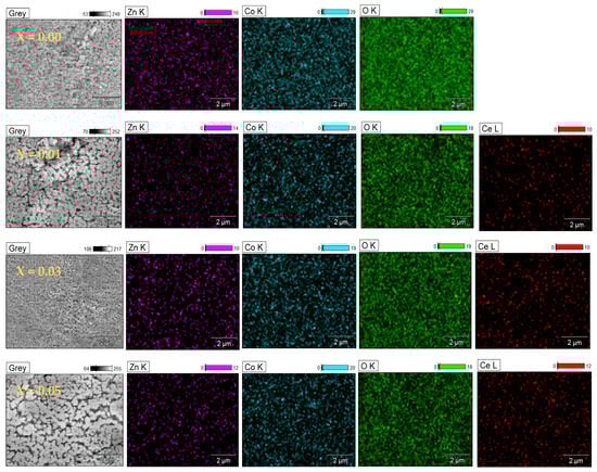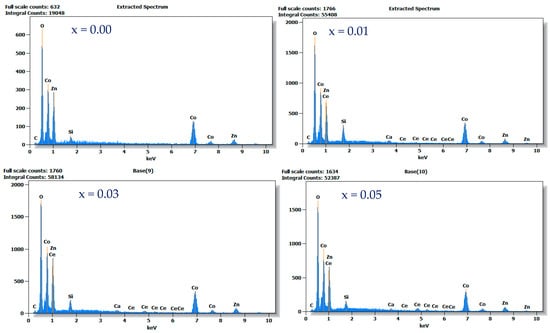 Energy-dispersive X-ray spectroscopy (EDS) was used to confirm the elemental composition of the thin films (Figure 6). The spectra clearly indicate the presence of Zn, Co, O, and Ce in the doped samples. Elemental mapping results (Figure 7) demonstrate a uniform spatial distribution of these elements across the film surface, confirming effective and homogeneous Ce incorporation. Additional signals corresponding to C, Si, and Ca are attributed to the underlying glass substrate used during deposition.
