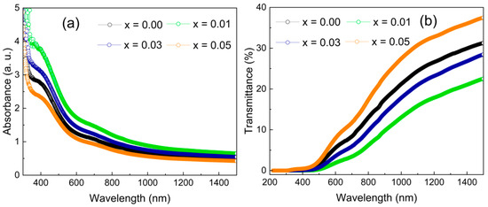 To assess the influence of Ce doping, the optical properties of thin films deposited on glass substrates were examined using UV–Vis–NIR spectroscopy. Figure 8a,b presents the absorbance (A) and transmittance (T) spectra for varying Ce concentrations. The absorption spectra exhibit two prominent bands centered around 428 nm and 698 nm, which are attributed to electronic transitions from the O 2p valence band to the Co 3d-eg and Co 3d-t2g states, respectively [32,33]. As the Ce content increases, particularly at x = 0.01 and x = 0.03, a noticeable enhancement in absorbance is observed, indicating the introduction of intra-bandgap states and a possible narrowing of the optical bandgap. These modifications in the electronic structure facilitate more efficient photon absorption, thereby suggesting improved light-harvesting capability. Concurrently, the transmittance spectra show a general increase with higher Ce doping levels, particularly for x = 0.05, reflecting reduced optical losses and enhanced transparency in the visible to near-infrared region. This combination of increased absorption and transmittance highlights the potential of Ce doping in tuning the optical properties of ZnCo2O4 thin films for use in optoelectronic applications.