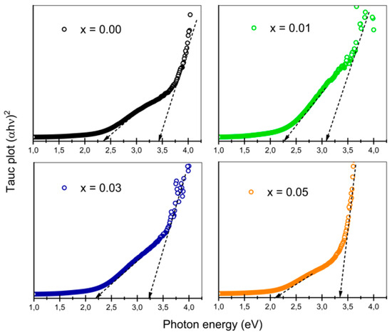 where hν is the photon energy, A is a constant, and Eg is the optical bandgap energy. Figure 9 shows the Tauc plots based on (αhν)2 versus hν, from which the bandgap energies were extracted by extrapolating the linear regions. Interestingly, the presence of two absorption features suggests that the films exhibit dual optical bandgaps. The lower-energy bandgaps were determined to be 2.32, 2.28, 2.25, and 2.22 eV for x = 0.00, 0.01, 0.03, and 0.05, respectively, which are consistent with values reported in earlier works [34]. In addition, higher-energy transitions yielded bandgaps of 3.38, 3.29, 3.24, and 2.98 eV across the same doping levels. The gradual decrease in the primary bandgap with increasing Ce content can be attributed to structural distortions and the introduction of Ce-induced defect states near the band edges, leading to band tailing effects. These observations align with previously reported results for polycrystalline materials where rare-earth doping alters the electronic structure and enhances sub-bandgap absorption [35].