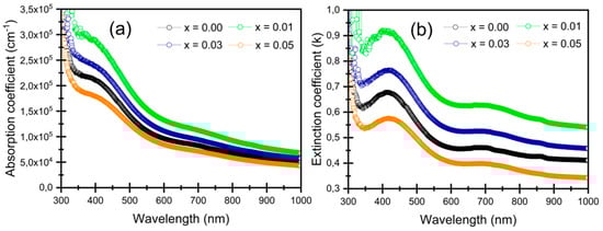 Variation of the absorption coefficient α (a) and the extinction coefficient k (b) as a function of wavelength for thin films.
