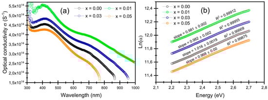 where α is the absorption coefficient, n is the refractive index, and c is the speed of light. These quantities were extracted from optical measurements performed on the doped and undoped films. As shown in Figure 11a, the optical conductivity increases significantly at Ce doping levels x = 0.01 and x = 0.03, indicating that cerium incorporation enhances charge carrier activity and facilitates optical transitions within the material. This enhancement is typically attributed to the introduction of additional donor states or improved carrier mobility due to Ce substitution in the ZnCo2O4 lattice. However, at a higher doping concentration (x = 0.05), a decline in σopt is observed, which may result from increased structural disorder or the formation of defect states that act as carrier traps, thereby limiting conductivity. This behavior suggests an optimal doping threshold beyond which the beneficial effects of cerium on carrier generation are diminished. Furthermore, the optical conductivity decreases progressively with increasing wavelength. This trend implies that at lower photon energies, the number of photo-generated carriers contributing to conduction diminishes, likely due to their recombination or trapping within localized states in the band gap. The relatively high σopt observed in the UV–visible range can be attributed to the excitation of free carriers by high-energy photons, which possess sufficient energy to overcome potential barriers and activate conduction pathways [41].