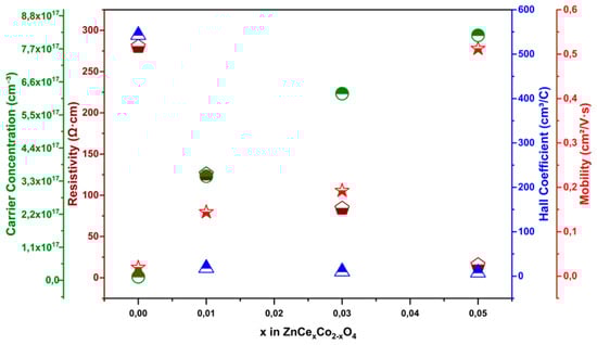 Figure 12 presents the electrical properties of thin films, measured using the Hall effect, including resistivity, carrier concentration, conductivity, mobility, and the Hall coefficient. The Hall effect analyzer enables the measurement of key electrical parameters such as resistivity, carrier concentration, conductivity, and the Hall coefficient [42]. These analyses help assess whether cerium (Ce3+) doping in ZnCo2O4 thin films effectively substitutes cobalt (Co3+) ions, potentially enhancing both carrier concentration and electrical conductivity. The electrical properties of ZnCo2O4 films were examined to evaluate the impact of Ce doping on cobalt substitution, carrier concentration, and resistivity. A significant reduction in resistivity is observed with increasing Ce content, dropping from 280.3 Ω·cm for the undoped film to 15.4 Ω·cm at x = 0.05. Simultaneously, the carrier concentration increases markedly, from 1.15 × 1016 cm−3 (x = 0.00) to 8.15 × 1017 cm−3 (x = 0.05). This increase in charge carriers confirms that Ce3+ plays an active role in modifying the electronic structure, promoting p-type conductivity in the spinel lattice. The positive Hall coefficient values across all compositions indicate that holes remain the majority charge carriers, confirming the p-type semiconducting behavior of the films. The decreasing trend of the Hall coefficient with increasing Ce content reflects the rise in carrier density and supports previous findings that oxygen-rich conditions promote hole conductivity in ZnCo2O4 [32,43]. Although mobility changes less dramatically, it contributes to the overall decrease in resistivity when combined with the increasing carrier concentration. Despite the larger ionic radius of cerium ions compared to cobalt ions, their incorporation into the ZnCo2O4 spinel lattice induces lattice distortions and creates oxygen vacancies. These defects promote charge compensation, increase active sites, and enhance electrical transport in materials [23]. Moreover, repeated electrical and optical measurements conducted several weeks after film synthesis under ambient conditions showed negligible changes, confirming the stability and reproducibility of the Ce-doped ZnCo2O4 thin films.