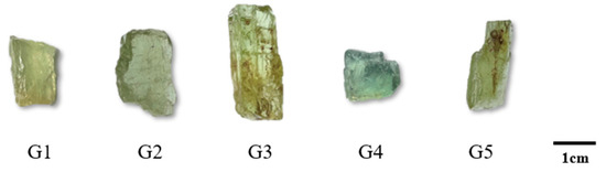 In this study, five yellow-green beryl samples were selected for this study (Figure 1). Among them, three samples (G1–G3) were used for heat treatment experiments. Samples G1 and G2 were each sliced into five pieces and subjected to thermal treatment under a single atmospheric condition. Sample G3 was cut into nine pieces, which were used separately under oxidizing and reducing atmospheres. Heat treatment was conducted using both a muffle furnace and a tubular furnace under oxidizing (air) and reducing (Ar/H2 mixed gas with a volume ratio of 95:5) atmospheres. For the oxidizing experiments, samples were heated directly in ambient air. In the reducing atmosphere, argon gas was first introduced for 30 min to remove residual oxygen from the furnace chamber. The samples were then heated at a constant rate of 5 °C/min to target temperatures of 400 °C, 500 °C, 600 °C, and 700 °C. Each sample was held at the designated temperature for 2 h, followed by natural cooling to room temperature. A controlled variable method was employed to ensure consistent experimental conditions across all treatments.