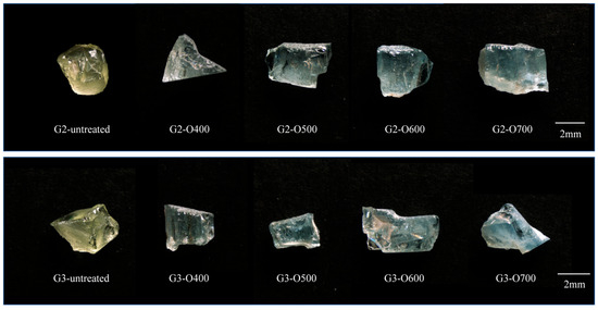 Color change of yellow-green beryl samples G2 and G3 after heat treatment in an oxidizing atmosphere.