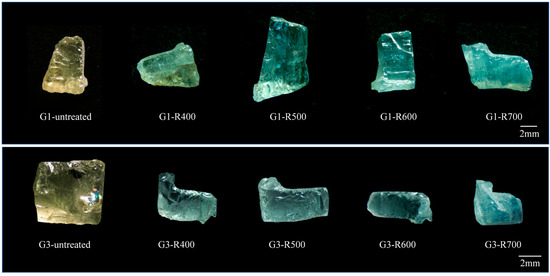 Color change of yellow-green beryl samples G1 and G3 after heat treatment in a reducing atmosphere.
