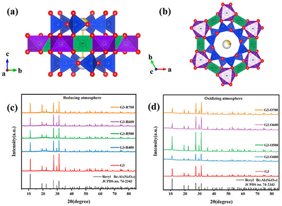 (a) Crystal structure of beryl viewed along (a) the a-axis and (b) the c-axis. The crystal structure visualization data were obtained using the software VESTA (Color figure online); (c,d) Beryl samples before and after heat treatment, the reducing atmosphere is set in H2 + Ar, and the oxidizing atmosphere is set in air.
