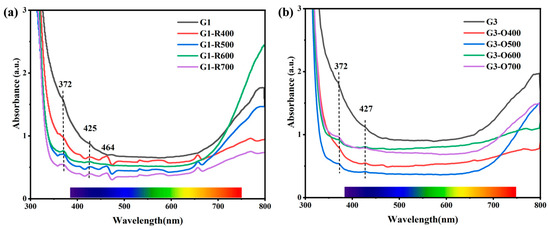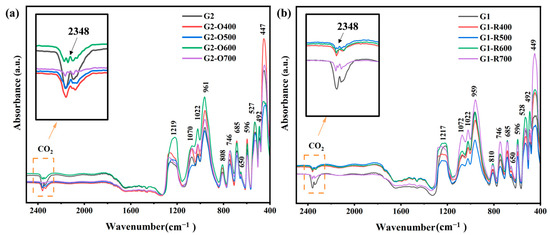 The infrared spectra of G1 and G2 samples before and after heat treatment are shown in Figure 6. The fingerprint region (400–1600 cm−1) displays consistent peak positions after heat treatment, and no clear linear relationship is observed between absorption intensity and temperature.