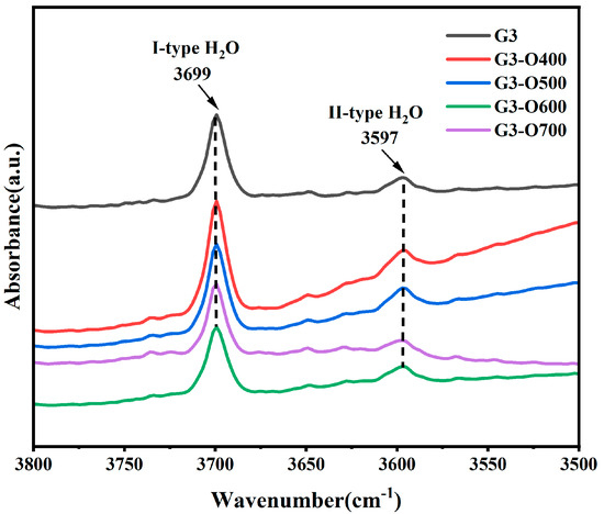 To further investigate the effect of heat treatment on water molecules within the structure, infrared transmission spectra were collected for sample G3 treated under oxidizing conditions. Portions of the sample were ground into a fine powder with a particle size of 200 mesh and mixed with potassium bromide (KBr) to prepare pellets for measurement. The spectral range of 4000–400 cm−1 was scanned, and the 3800–3500 cm−1 region was extracted for analysis. As shown in Figure 7, all samples exhibit a strong absorption band near 3699 cm−1 corresponding to type I water (asymmetric stretching), and a weaker band near 3597 cm−1 corresponding to type II water (symmetric stretching), with type I water being dominant [25]. As temperature increases, notable changes are observed in the absorption behavior of water: at 400–500 °C, the intensities of both types remain stable, whereas at 600–700 °C, the absorption intensity of type II water significantly decreases. This reduction is likely related to structural rearrangements involving Na–O–H complexes within the channels. Upon the release of some doubly coordinated H2O molecules, an increase in structural symmetry may lead to reduced asymmetric vibrational absorption [26]. Simultaneously, the strengthening of Na–O bonds may suppress H–O vibrations, further contributing to the attenuation of the type II water absorption band.