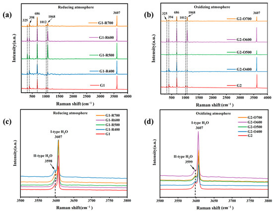 To investigate the behavior of water molecules after heat treatment, the Raman spectra in the range of 3500–3800 cm−1 were examined (Figure 8c,d). The results showed that the vibrational characteristics of water molecules were not dependent on crystal orientation. At 700 °C, both type-II (3598 cm−1) and type-I (3607 cm−1) water peaks were still detected under both oxidizing (G2-O700) and reducing (G1-R700) atmospheres. These observations confirm that type-I and type-II water molecules remain present at 700 °C, and the intensities of their associated peaks do not show a clear correlation with temperature. This finding is consistent with the previous infrared transmittance analysis. According to previous studies, dehydration of beryl slices occurs above 850 °C, while powdered samples release all structural water only in the 800–900 °C range [22,27]. Thus, the symmetric stretching bands of water molecules can still be detected at 700 °C.