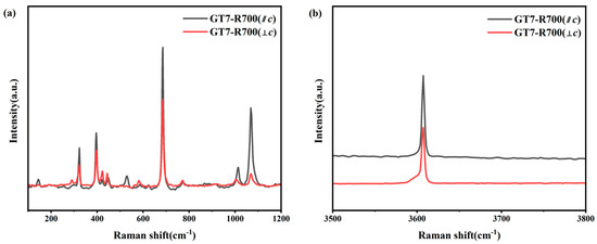 Raman spectra of the G1-R700 sample collected along two orientations: (a) 100–1200 cm−1 region; (b) 3500–3800 cm−1 region.