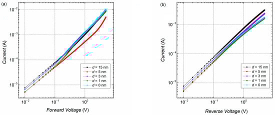 Typical current–voltage characteristics of investigated junctions with different h-BN layer thicknesses at room temperature are shown in Figure 2 (these current–voltage characteristics in semi-log scale are presented in Figure S2 in Supplement S2). No apparent differences are observed between the samples with a h-BN layer and without. At forward bias in the low-voltage regime and at reverse bias over a broader range, the current scales linearly with voltage, indicating dominant ohmic behavior. At higher forward voltages, a nonlinearity appears in all samples, indicating possible Schottky emission or other field-enhanced conduction mechanisms, such as Poole–Frenkel (PF) emission, direct tunneling, or Fowler–Nordheim tunneling. Such conduction mechanisms are often observed in graphene-based devices [11,17,53]. In graphene/semiconductor junctions, Schottky emission is widely accepted as a dominant conduction mechanism [3,11,16,17]. However, when an insulator, such as h-BN, is inserted between graphene and a semiconductor, the determination of current conduction requires special attention. For example, when direct tunneling is dominant, the Richardson coefficient in the Schottky equation should be modified with a transmission factor. This factor depends on the insulator thickness and the barrier height at the semiconductor/insulator interface [1,11].