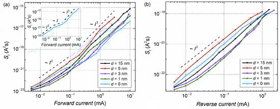 Typical graphs of current noise spectral density vs. forward (a) and reverse (b) current at 1044 Hz frequency; d—h-BN interlayer thickness. The inset in (a) represents the SI(I) dependence of the reference sample.