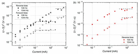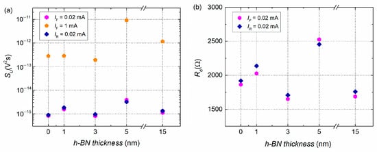 A “white” spectral region attributed to thermal noise is observed at low forward and reverse bias when f > 2 kHz, as can be seen in Figure 3 at 0.005 mA and 0.01 mA currents. At such low currents, thermal noise is dominant and sets a limit for the minimum observable noise level. The intensity of thermal noise (SU = 4kTRd, k—Boltzmann’s constant, T—temperature) is determined by the differential resistance Rd of the investigated junction at the linear I-V characteristic part (for a representative sample of a 3 nm thickness h-BN layer in Figure 3, Rd = 1410 Ω). In some cases, thermal noise is masked by higher 1/f noise intensity. An example is illustrated in Figure 3b for a junction with a 5 nm h-BN layer at 0.01 mA.