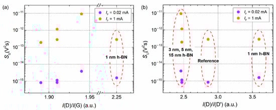 Average voltage noise spectral density vs. I(D)/I(G) (a) and I(D)/I(D’) ratios (b). The SU was measured using an IF of 0.02 mA and 1 mA and a frequency of 1044 Hz.