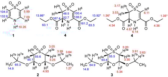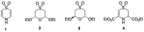 Although there is one early claim to have isolated 1,4-thiazine as a stable liquid [5], this has never been reproduced and must be treated with scepticism. In the course of recent studies aimed at generation and isolation of this fundamental but hitherto unknown heterocyclic compound, we have prepared and characterised several related compounds, and we present here the structural characterisation of 1,4-thiazine S,S-dioxide 1, cis-2,6-diethoxy-1,4-oxathiane S,S-dioxide 2, trans-2,6-diethoxy-1,4-oxathiane S,S-dioxide 3, and diethyl 3,4-dihydro-2H-1,4-thiazine-3,5-dicarboxylate S,S-dioxide 4 (Figure 1). Rather remarkably for such simple compounds, the extent of previous NMR characterisation is rather limited. Specifically, for 1, 2, and 3, there are only low frequency 1H spectra [6,7], and 4 is a previously unknown compound. We therefore also present here fully analysed and assigned 1H and 13C NMR data for all four compounds.