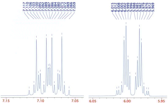 This pattern could be successfully simulated, however, using the precise chemical shifts of 7.088 and 5.992 and the coupling constants in Table 2. With these values, we were able to reproduce the pattern exactly with the same number and relative size of peaks and all 32 chemical shifts agreeing to ±0.002 ppm (see Supplementary Materials). The complexity of the patterns for the simple AA’MM’X system is explained by a total of six different coupling constants, including between chemically equivalent but magnetically non-equivalent protons H2/H6 and H3/H5 and even a weak five-bond coupling diagonally across the ring. The values are also in reasonable agreement with those previously reported [17], although in that case, no coupling to NH was apparently observed.