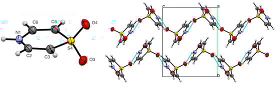 The molecular structure of 1 is almost but not quite planar, showing a slight boat shape with N1 0.040(4) and S4 0.093(4) Å below the plane defined by the four carbon atoms (Figure 4). More significantly, the sulfone function is distinctly unsymmetrical with one shorter bond S4–O4 of 1.442(2) Å placing O4 1.022(6) Å above the carbon atom plane and one longer bond S4–O3 of 1.453(3) Å placing O3 1.383(6) Å below it. This is explained by strong intermolecular hydrogen bonding between O3 and the NH (Table 3), which results in the molecules forming infinite zig-zag chains when viewed along the a-axis and additional non-classical hydrogen bonds from C3 and C5 (Table 3), which link adjacent intermolecular chains.