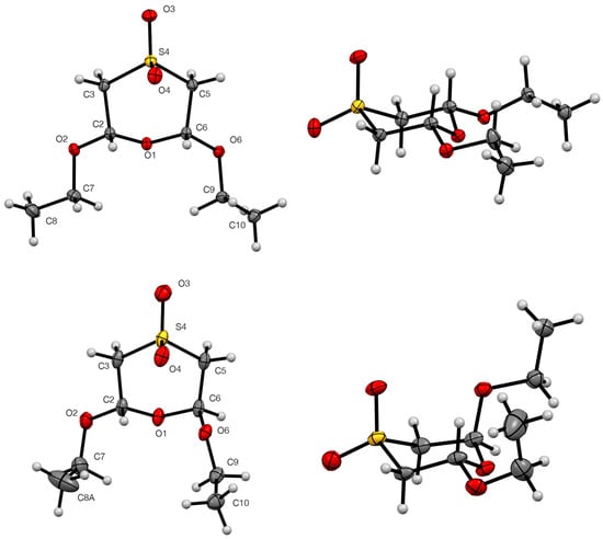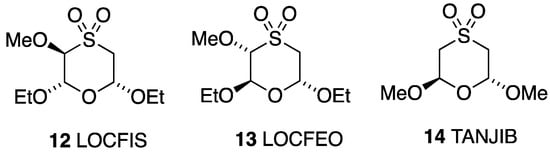 The bond lengths and angles around the heterocyclic rings (Table 4) are in good agreement with those reported for the three 1,4-oxathiane S,S-dioxides that have previously been crystallographically characterised (Figure 7). Compound 12 also adopts a chair conformation with all substituents equatorial, while the isomer 13 has the adjacent methoxy and ethoxy groups both axial and the remaining ethoxy equatorial [22]. The structure of the trans dimethoxy compound 14 [23] is exactly analogous to that of 3 with one group axial and one equatorial. As might be expected, none of these compounds show significant intermolecular interactions.
