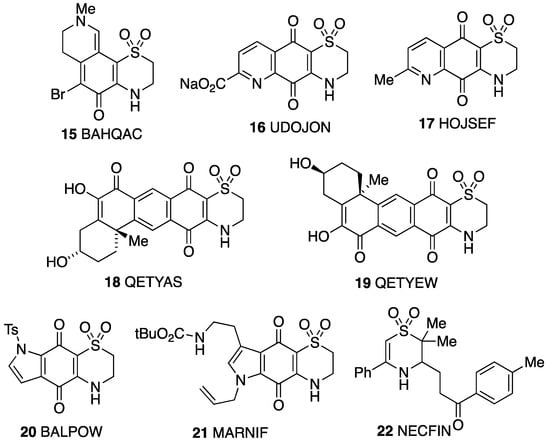 A good number of structures containing a 2,3-dihydro-1,4-thiazine S,S-dioxide ring have been determined (Figure 9), but these almost all have two or more additional rings fused to the thiazine double bond and no substituent at the 3-position adjacent to NH. The interest in these structures stems from their isolation as natural products from marine sources and potential medicinal activity. Thus, euthyroideone A 15 [24] was obtained from a New Zealand bryozoan, while ascidiathiazone A 16 [25] was obtained from a New Zealand ascidian, and both it and its analogue 17 [26] were tested for anti-inflammatory activity. The regioisomers xestosaprol O 18 and xestosaprol N 19 isolated from a Micronesian marine sponge are inhibitors of indoleamine 2,3-dioxygenase [27]. The compound 20 is an intermediate in the synthesis of the core structure of antimalarial thiaplakortone analogues [28], and the same group also determined the structure of an intermediate 21 with the regioisomeric ring system [29]. The structural parameters of the dihydrothiazine ring in all these examples are in good agreement with those for 4 with the same half-chair conformation in each case. These examples show a range of interesting hydrogen bonding patterns, but these generally involve bonding of NH to a carbonyl oxygen rather than to sulfone SO. In compound 20, however, there is intermolecular NH to sulfone SO bonding forming cyclic tetramers.