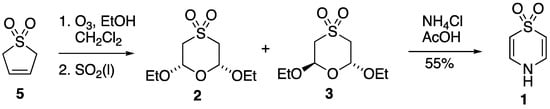 A reliable although unusual synthesis of compound 1 appeared in 1972 [6], and in fact, this is its only reported synthesis to date. The method starts from the readily available 2,5-dihydrothiophene 1,1-dioxide (butadiene sulfone) 5, which is subjected to ozonolysis in dichloromethane containing ethanol (Scheme 1). Once ozone absorption is complete, the mixture is reductively quenched by rapid addition of liquid sulfur dioxide to give a mixture of the cis- and trans-2,6-diethoxy-1,4-oxathiane 4,4-dioxides 2 and 3 in essentially quantitative yield. Treatment of this mixture with ammonium chloride in boiling acetic acid directly produced thiazine dioxide 1, but for spectroscopic and structural characterisation, 2 and 3 were readily separated by column chromatography. It might be noted here that compound 3 has been prepared in low yield by treatment of sulfonyldiacetaldehyde with boron trifluoride and ethanol [16], and both 2 and 3 have also been prepared by peracetic acid oxidation of the corresponding 1,4-oxathianes [7].