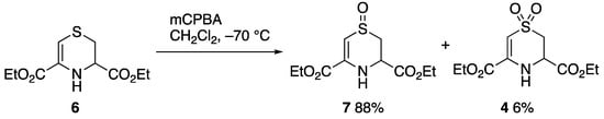 Compound 4 was obtained as a minor product in the low-temperature mCPBA oxidation of the dihydrothiazine diester 6 (Scheme 2), itself obtained by condensation of cysteine ethyl ester with ethyl bromopyruvate [8]. Chromatography of the product yielded sulfone 4 as a minor product eluting before the main sulfoxide product 7.