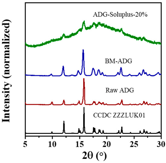 Commercial ADG (raw ADG) is a white crystalline powder. The powder X-ray diffraction (PXRD) pattern of raw ADG is consistent with the simulated pattern (Figure 1), indicating that raw ADG is the crystalline form. The strongest diffraction peak of raw ADG is at 2θ with 15.8°, and the disappearance of this peak was used to judge the formation of the amorphous phase. The PXRD pattern of the neat ball-milled raw ADG (BM-ADG) remained unchanged compared to that of raw ADG, indicating that the ADG crystalline form is not altered during the neat ball milling process. Soluplus is a novel carrier for the formation of stable amorphous solid dispersions, improving the solubility of poorly water-soluble drugs [25]. However, the preparation of amorphous solid dispersions of ADG and Soluplus by neat ball milling failed, and the content of ADG was 20%. The referenced peak at 15.8° was prominent in the PXRD pattern of the product of ADG–Soluplus. Amorphous solid dispersions are not suitable for ADG pharmaceutical formulations with high content of ADG, as the preparation of ADG amorphous solid dispersions with ADG content exceeding 20% cannot be realized.