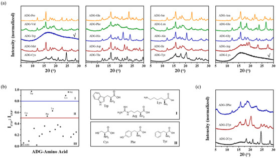 Twenty common amino acids were screened to prepare the co-amorphous ADG in this work, and the neat ball-milled products of ADG and amino acids with a molar ratio of 1:1 were prepared and termed ADG–amino acids (Figure 2a). The neat ball milling method is the most common method to prepare co-amorphous systems [26,27]. The PXRD patterns show that only ADG-Trp and ADG-Lys do not have sharp diffraction peaks, indicating amorphous characteristics. Considering that the signal at 2θ of 15.8° originates from crystalline ADG, and the signal at 2θ of 17.0° has only contributions from amorphous scattering and no overlap with the signals of the crystal phases of ADG or the amino acids, the ratio of the signal intensity at 17.0° and that at 15.8° was used to represent the amorphization degree of ADG (Figure 2b). A higher ratio indicates a higher degree of amorphization. The 20 products were categorized into three classes: Class I includes ADG-Trp, ADG-Lys, and ADG-Arg, with a high ADG ratio (>0.8), where the crystalline ADG signal was not observed; Class II includes ADG-Cys, ADG-Phe, and ADG-Tyr, with the ADG ratio ranging from 0.5 to 0.8, with a weak ADG signal; Class III includes the remaining products, with strong ADG signals. For Class II of amino acids, ADG-2Cys, ADG-2Phe, and ADG-2Tyr, with a molar ratio of 1:2, were prepared (Figure 2c). ADG-2Cys almost shows no crystalline ADG signal, while ADG-2Phe and ADG-2Tyr still exhibit crystalline ADG signals. In summary, ADG-Trp, ADG-Lys, ADG-Arg, and ADG-2Cys show totally amorphous ADG, and only ADG-Trp and ADG-Lys belong to co-amorphous systems, as ADG-Arg and ADG-2Cys show the signals of crystalline arginine and cysteine.