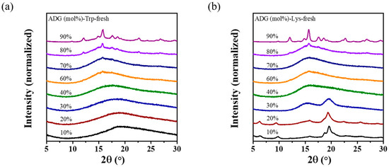 ADG-Trp and ADG-Lys systems with different molar ratios were prepared and investigated. The PXRD patterns of fresh ADG-Trp systems show that ADG-Trp with ADG molar content from 10 mol% to 50 mol% is a co-amorphous system (Figure 3a). There are some signal traces of crystallized ADG observed from the PXRD patterns of ADG-Trp-60 mol% and 70 mol%. The PXRD patterns of fresh ADG-Lys systems show that ADG-Lys-40 mol% to 70 mol% are co-amorphous systems (Figure 3b). Crystallized lysine signals are observed in the PXRD patterns of ADG-Trp-10 mol% to 30 mol%, and crystallized ADG signals are observed in the PXRD patterns of ADG-Trp-80 mol% to 90 mol%.