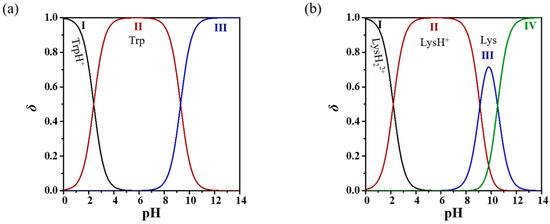 Figure 4. δ-pH diagrams of (a) tryptophan (Trp) and (b) lysine (Lys).