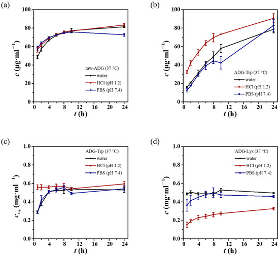 Three dissolution media, namely pure water, HCl buffer (pH 1.2), and PBS (pH 7.4), were used to compare the dissolution properties of ADG-Trp and ADG-Lys. The dispersion concentration of ADG was settled at 1.00 mg·mL−1. The ADG dissolution profiles of raw ADG in the three media are similar (Figure 5a). Typically, in the medium of water, raw ADG exhibits rapid dissolution at the early stage, with an ADG concentration of 49 μg·mL−1 at 1 h. The ADG concentration gradually increases to 72 μg·mL−1 at 6 h and slowly reaches 80 μg·mL−1 at 24 h, which is similar to the reported ADG solubility of 65 μg·mL−1 at 35 °C and 73 μg·mL−1 at 40 °C [32].