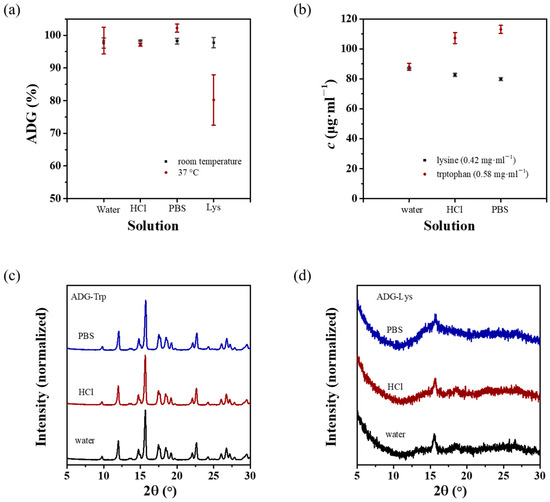 Figure 6. Changes in ADG solutions and solids during the dissolution process. (a) ADG% of the ADG solutions after one day of storage in different media, including water, HCl buffer, PBS, and 0.42 mg·mL−1 Lys solution, at room temperature and 37 °C; (b) apparent solubilities of ADG in different media, including 0.58 mg·mL−1 Trp or 0.42 mg·mL−1 Lys at 37 °C (0.42 mg·mL−1 and 0.58 mg·mL−1 are the total dissolution concentrations of Lys and Trp in the dissolution experiments, respectively); PXRD patterns of the residual ADG solids after one hour of dissolution in the three media for (c) ADG-Trp and (d) ADG-Lys.