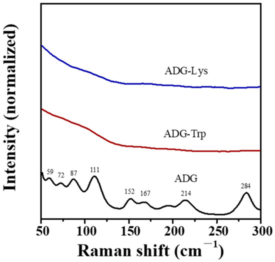 Low-frequency Raman spectroscopy (Figure 8) reveals that raw ADG exhibits Raman bands at 59, 72, 87, 111, 152, 167, 214, and 284 cm−1, while ADG-Trp and ADG-Lys show no bands. The Raman results indicate that raw ADG is crystalline, and ADG-Trp and ADG-Lys are amorphous [33].