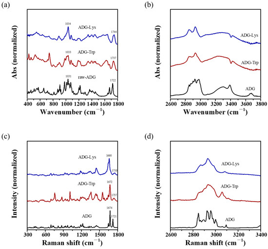 Figure 9. Vibrational spectroscopic analysis of raw ADG, ADG-Trp, and ADG-Lys. (a) Mid-frequency IR spectra, (b) high-frequency IR spectra, (c) mid-frequency Raman spectra, and (d) high-frequency Raman spectra.